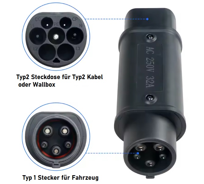 Geeignet um Fahrzeuge mit altem Typ1 Stecker mit einem Typ2 Kabel oder Ladegerät zu laden.